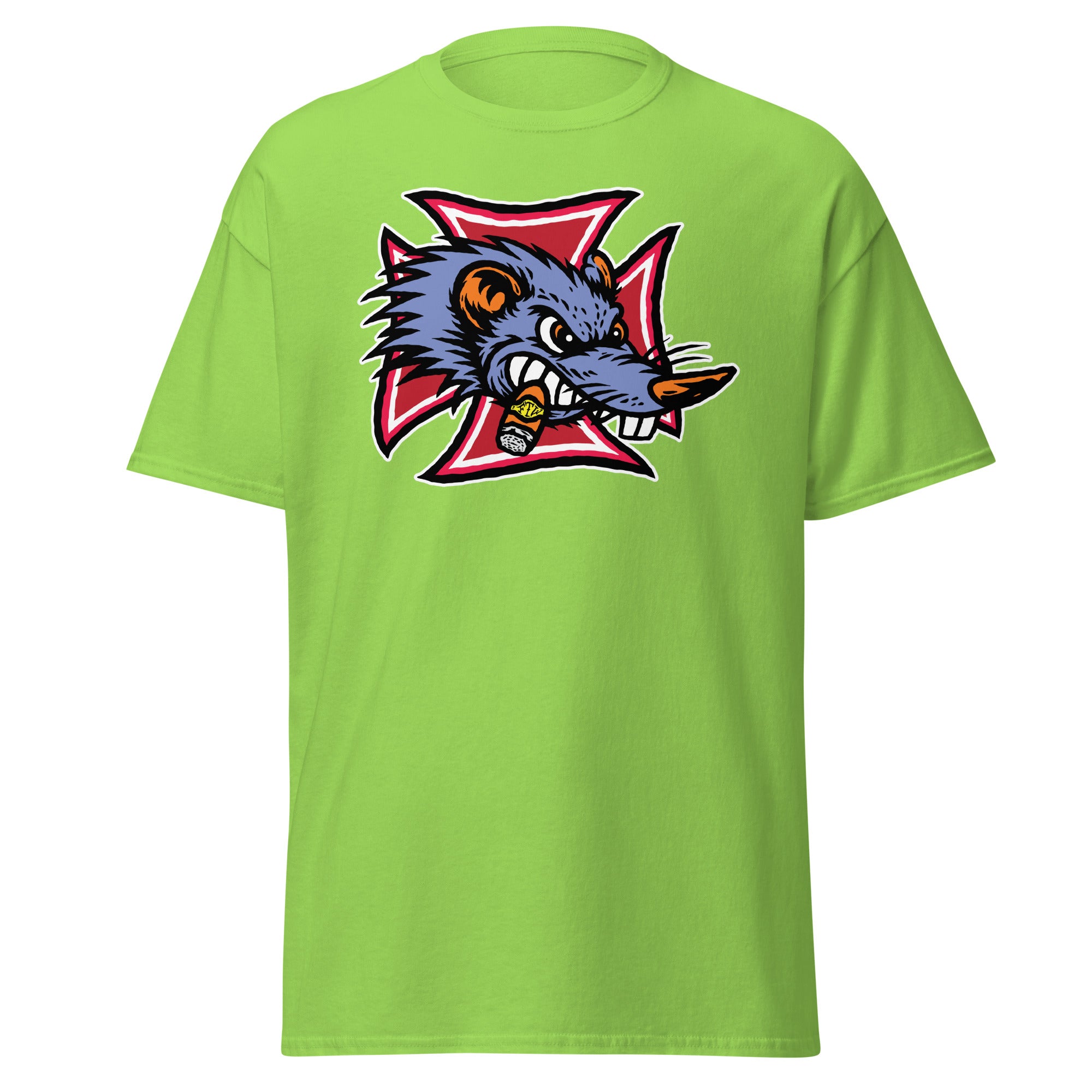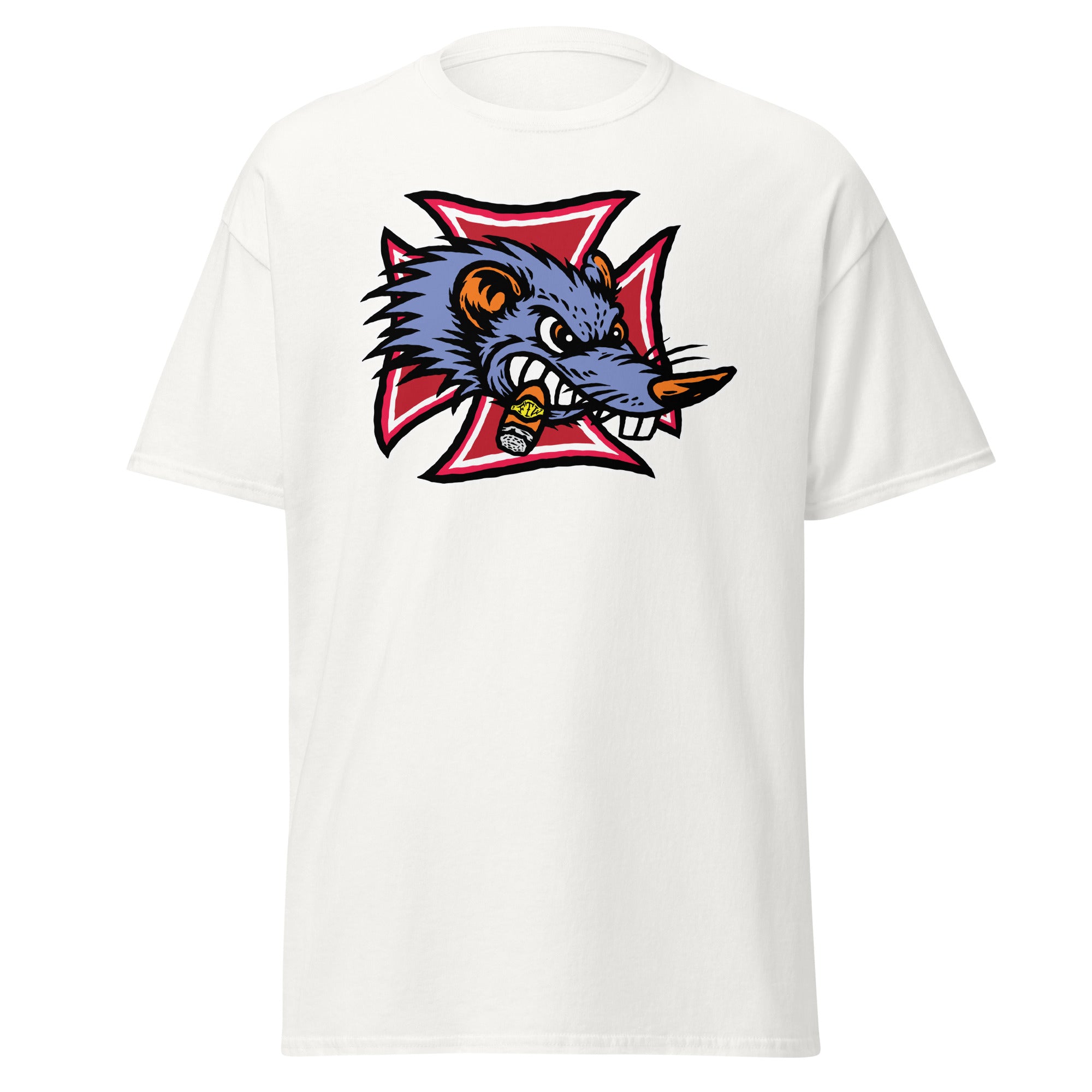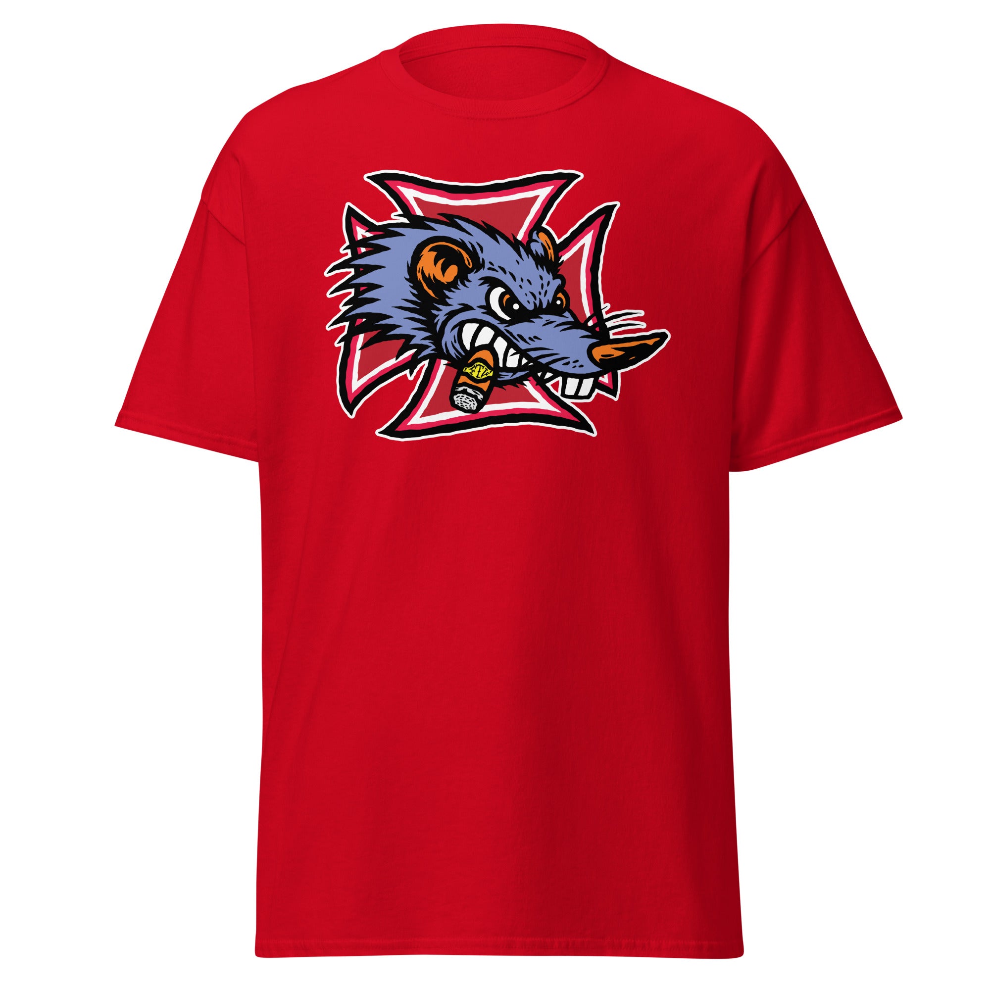 The Gnarly Rat FTW tee is built for the kustom kulture lifers — the chopper riders, hot rodders, muscle car maniacs, and anyone who lives loud and builds it their own way. Front and center is a savage rat snarling through clenched teeth, chomping a stogie and backed by a bold iron cross — a straight-up salute to outlaw garages, grease-stained hands, and full-throttle attitude.