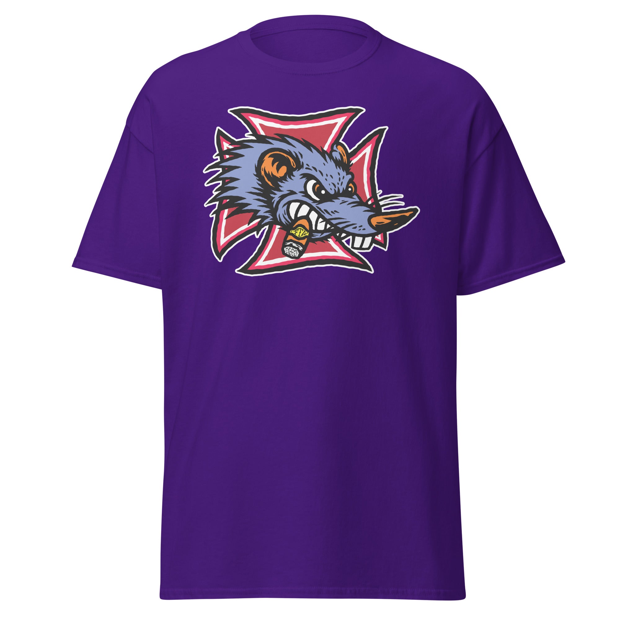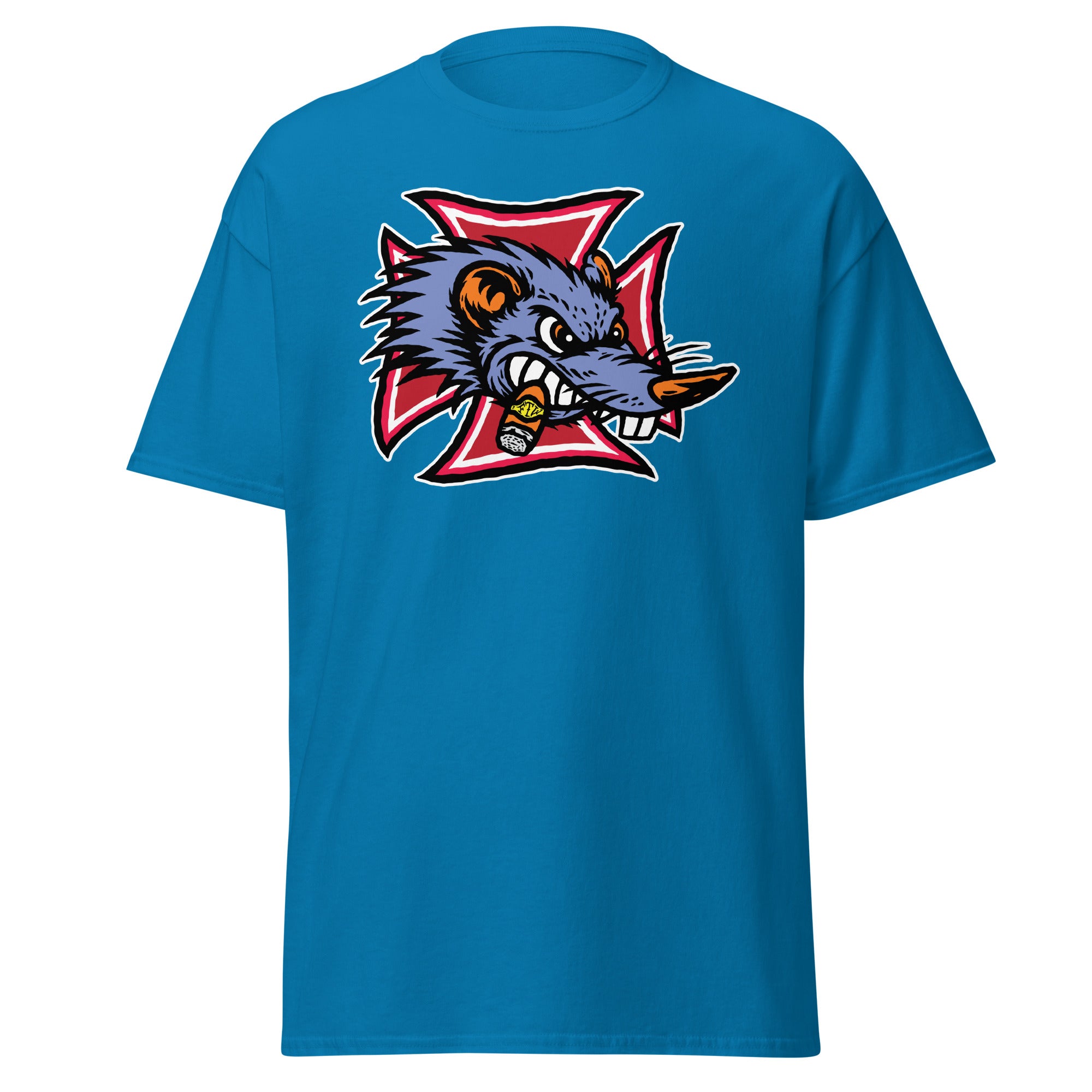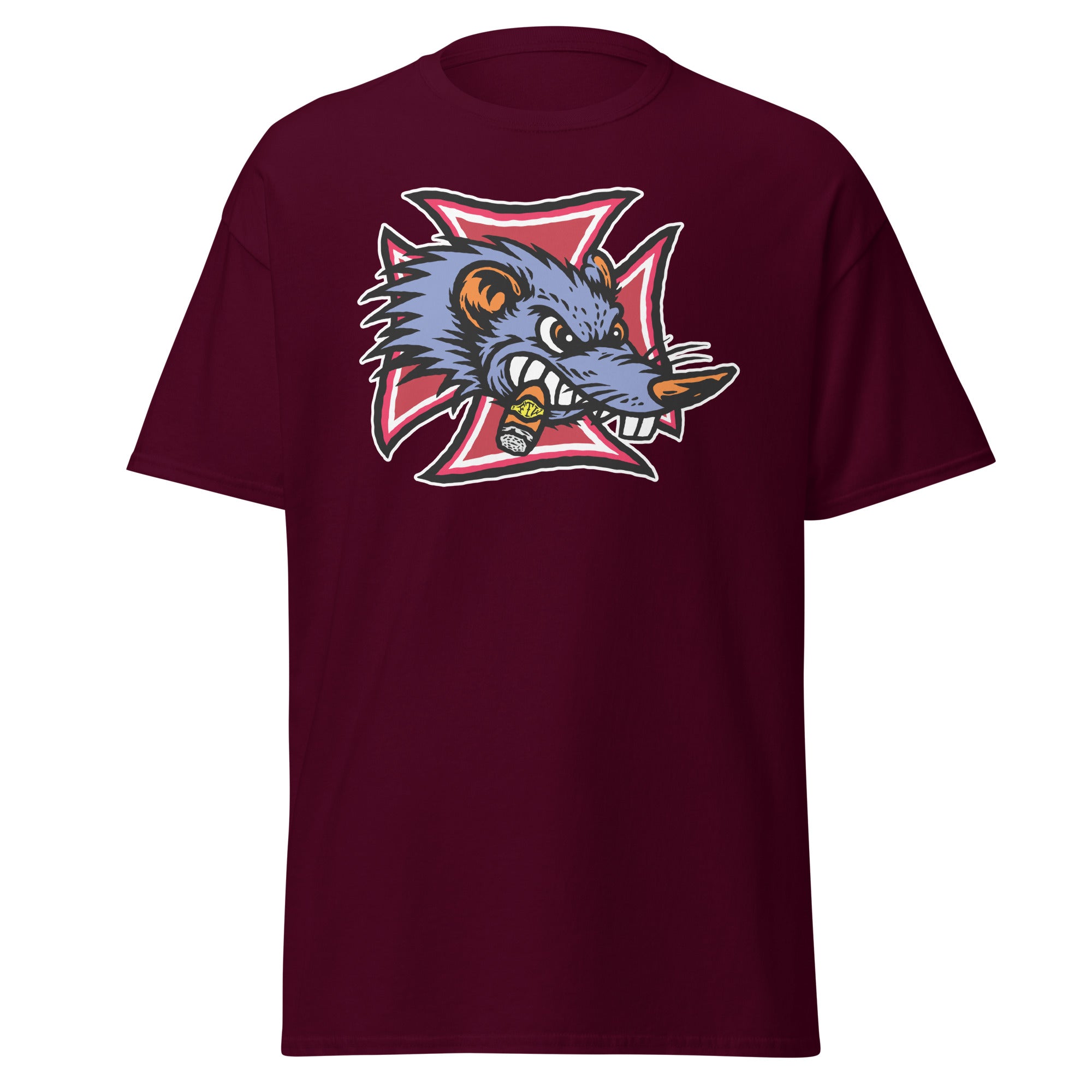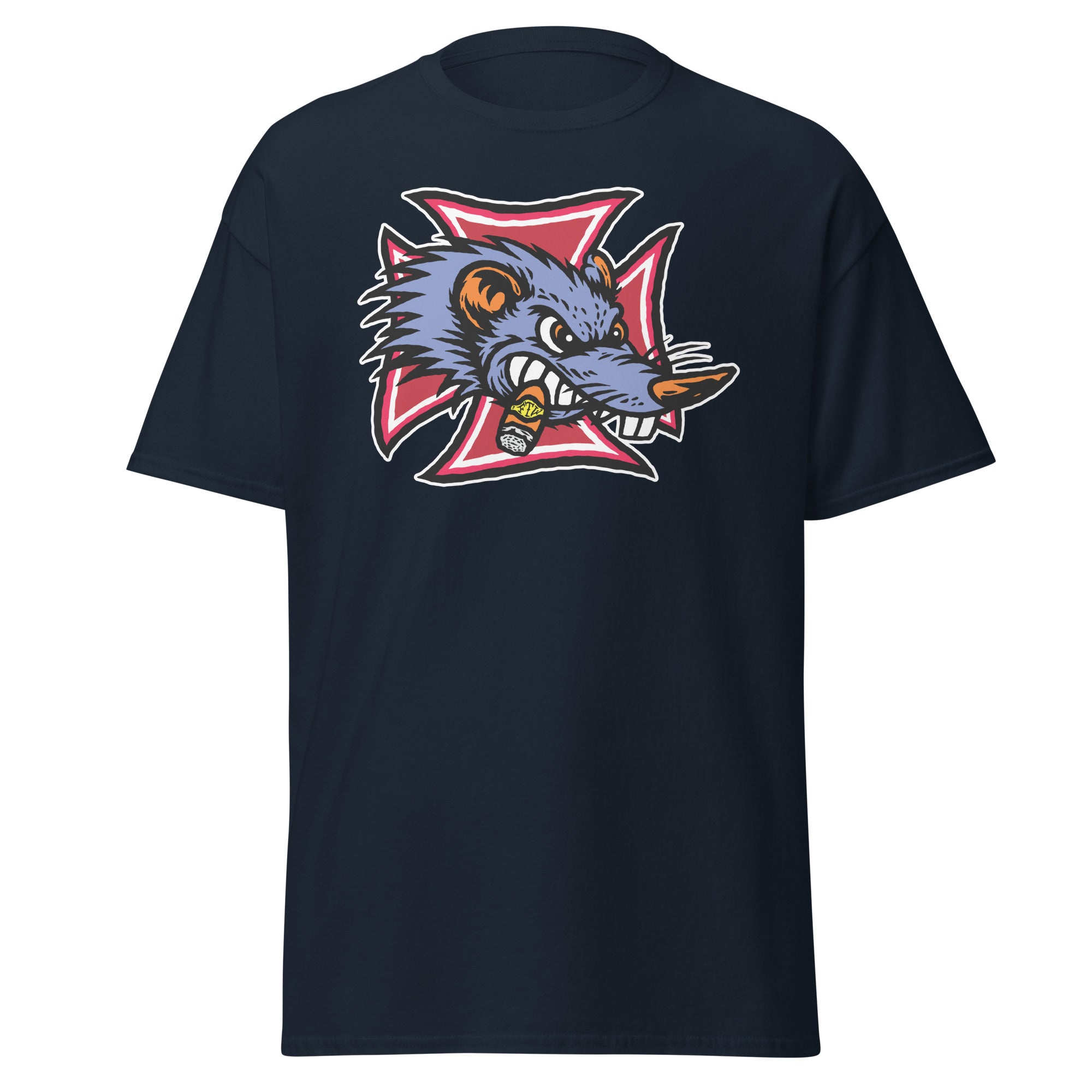 The Gnarly Rat FTW tee is built for the kustom kulture lifers — the chopper riders, hot rodders, muscle car maniacs, and anyone who lives loud and builds it their own way. Front and center is a savage rat snarling through clenched teeth, chomping a stogie and backed by a bold iron cross — a straight-up salute to outlaw garages, grease-stained hands, and full-throttle attitude.